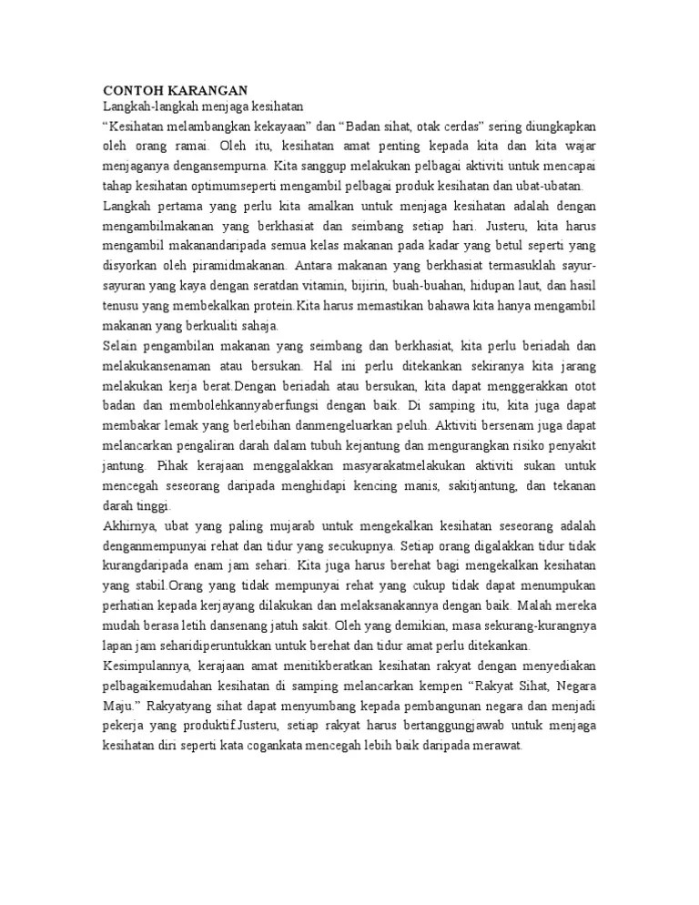 Mar 30, 2020 · di bawah adalah contoh karangan cara menjaga kesihatan diri dan keluarga sebagai rujukan untuk semua. Terdapat dua contoh karangan yang dikongsikan dibawah ini untuk panduan semua pelajar dalam menghasilkan karangan yang berkualiti.